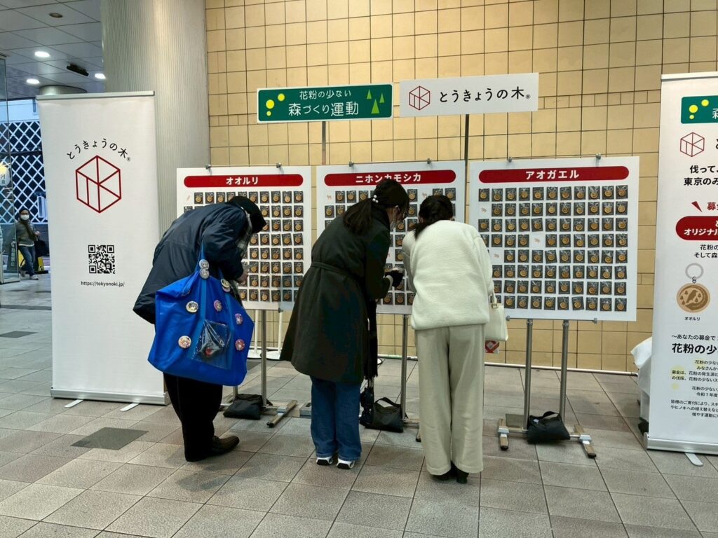 12月14~15日、渋谷マークシティのイベントスクエアで「花粉の少ない森づくり運動」の募金活動が行われ、協力者に多摩産材のエシカルブランド「とうきょうの木®」のオリジナルチャームが配布されました。渋谷駅前の神宮通り沿いで実施し、2日間の取り組みです。花粉の少ない森づくりは、花粉を多く飛散させるスギ・ヒノキ人工林を伐採し、花粉の少ないスギなどへ植え替えることで森林の健全化につなげる活動です。今回配布されたチャームは、高校生・専門学校生・大学生が8月から参加した「とうきょうの木® ブランドをつくろう!プロジェクト」でデザインし、森林循環をイメージしました。運動側は募金と木材ブランドの認知を同時に進め、森林へ資金が回る流れづくりを狙います。今後は企業・流通事業者との連携を深め、東京都の地域材利用の拡大を目指す方針です。