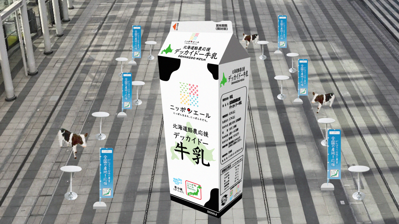 会場には、床面に全長約12メートルの巨大牛乳パックのトリックアートを設置します。1頭の牛の年間搾乳量8,000Lを可視化した演出で、指定角度から撮影すると立体的に見える仕組みです。バックハグのフォトスポットや、展示「知ってミルク」、クイズ「ミルクイズ」も用意します。