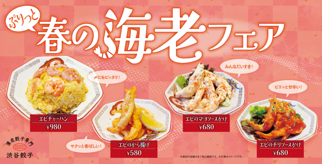 薄皮餃子専門「渋谷餃子」は2026年3月2日から、渋谷本店と新宿西口店で期間限定企画「春の海老フェア」を始め、海老料理4品を販売します。価格は海老チャーハン980円、海老のから揚げ580円、海老のマヨソースかけ680円、海老のチリソースかけ680円(いずれも税込)です。