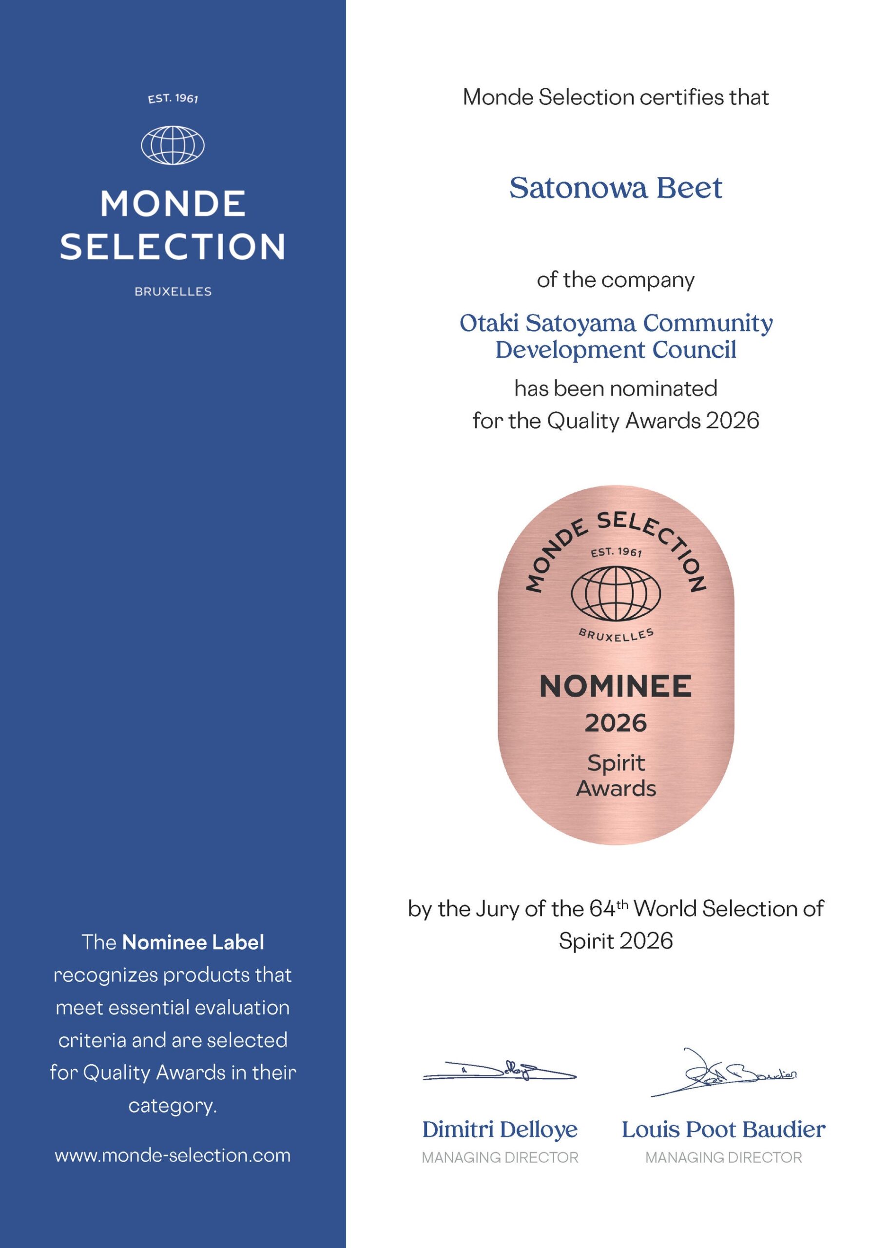 滋賀県多賀町の「おおたき里づくり研究所」が手がけるクラフトリキュール「里和浸酒 SATONOWA® ビーツ」(アルコール分16%)と「SATONOWA® No.3 クロモジ&赤シソ」(同15%)の2作品が、Monde Selection主催「World Selection of Spirits 2026」(第64回)のQuality Awards 2026にノミネート認定されました。