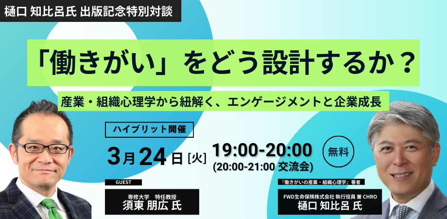 登壇するのはFWD生命保険の執行役員兼CHROの樋口知比呂氏と、専修大学特任教授の須東朋広氏です。第1部は書籍内容を軸にした基調講演、第2部は対談とし、Q&Aと交流会も行います。