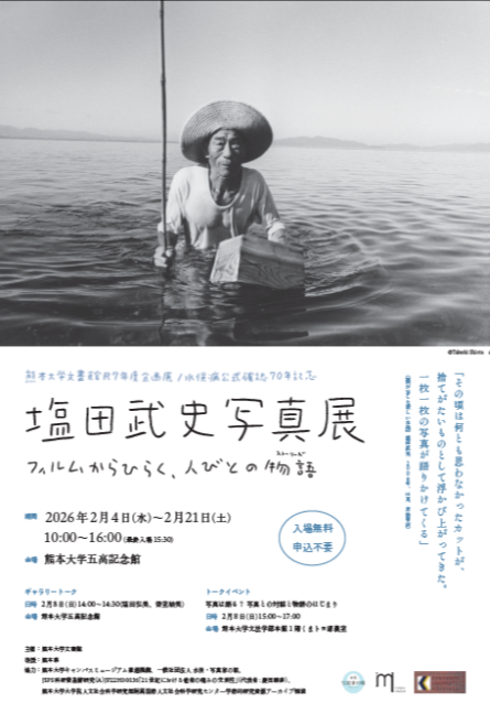 熊本大学文書館は2026年2月4日~21日、水俣病の公式確認70年を機に、写真家・塩田武史(1945~2014)の企画展を熊本大学五高記念館で開きます。開館は10時~16時(最終入場15時30分)で、観覧無料・申込不要です。