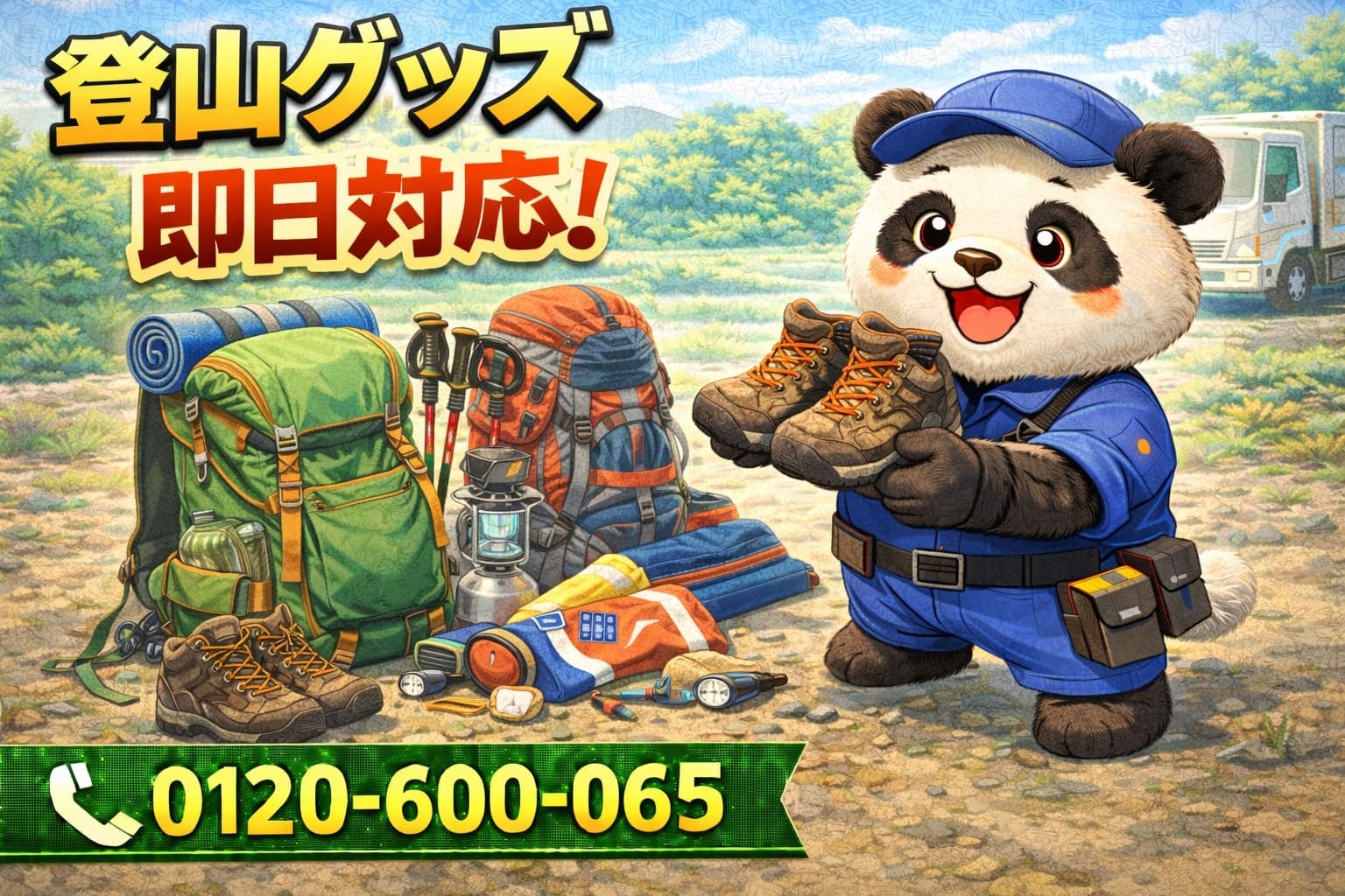 対象は登山リュック、トレッキングポール、登山靴、ヘッドライト、携帯コンロなどで、これらを含む不用品回収で割引が適用されます。見積もりはLINEで写真を送って相談でき、電話(0120-600-065)でも問い合わせ可能としています。