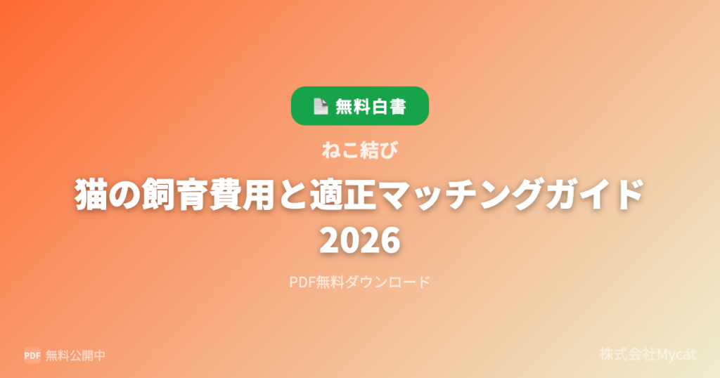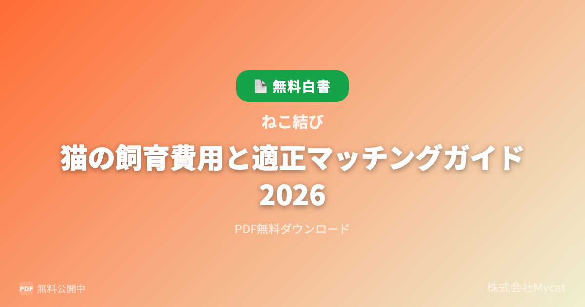 Mycat(東京都目黒区)は3月25日、同社が提供する「ねこ結び」で『猫の飼育費用と適正マッチングガイド 2026』をPDFで無料公開しました。猫の飼育頭数は約906万頭、生涯飼育費用は約150〜250万円といった数値を示し、飼育判断の材料を整理します。入手は指定ページでフォーム入力してダウンロードします。
