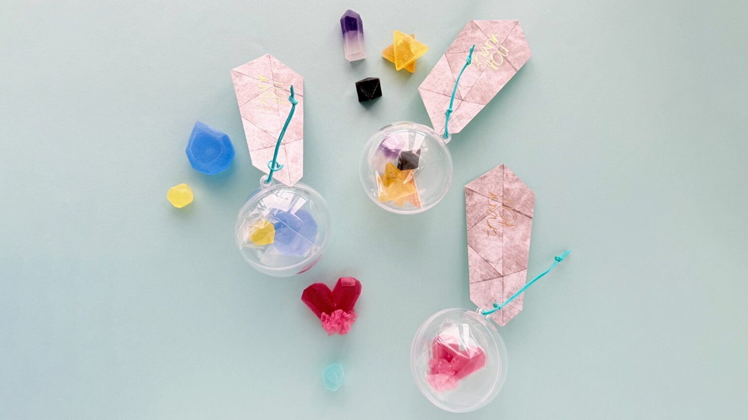 商品は、職人が小刀で宝石・鉱物のように切り出した琥珀糖をカプセルに封入し、「Thank you」メッセージカードを添えて提供します。琥珀糖は外側がシャリッと硬く中がやわらかい和菓子で、見た目の華やかさをギフト用途に生かします。