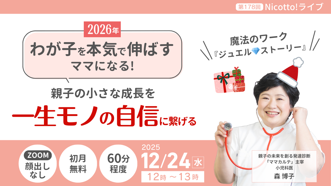 発達障害・グレーゾーンの子どもを育てる保護者向けオンライン子育て塾「Nicotto!塾」は、2025年12月24日12時から、子どもの「できた!」を見つけて親子の自信につなげるワークを体験する会員限定オンラインライブをZoomウェビナーで開きます。参加は無料会員登録が必要で、初月費用は無料です。パネリストは小児科医として1,600組以上の親子に関わってきた森博子氏です。年末は「できなかったこと」に目が向きやすい一方、発達特性のある子の家庭では注意や指摘が重なりやすく、子どもの自信や行動量に影響し得るとし、子どもを変えるより“見方”を変える視点を学ぶ場と位置づけます。ライブでは子どもの行動を「褒めポイント」に言い換える実践ワーク「ジュエルストーリー」を扱い、2025年の振り返りから2026年の関わり方を考える内容です。継続開催の仕組みとして毎週水曜12〜13時に実施し、見逃し配信やチャット質問にも対応するとしており、年末の参加を入口に学習継続へつながるかが注目されます。