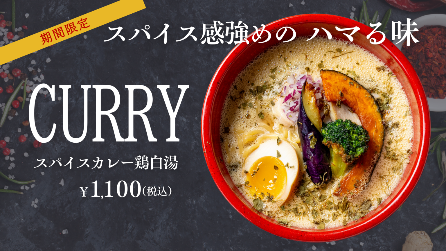 今回の新作は、白く濁った濃厚な鶏白湯(鶏を煮込んだ白濁スープ)に複数のスパイスを組み合わせ、鶏のコクを立てつつスパイスの余韻が後半に広がる味設計をうたいます。具材にはかぼちゃとブロッコリーの素揚げを加え、スープカレーを想起させる見た目も意識したとしています。
