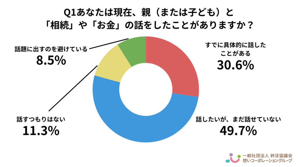 終活ガイド資格取得者435人への調査で、親子で相続やお金の話を「すでに具体的にした」人は30.6%にとどまり、「話したいが、まだ話せていない」が49.7%と半数近くを占めました。相続の重要性を自覚しながらも、実際の対話には踏み出せていない人が多い実態が明らかになりました。