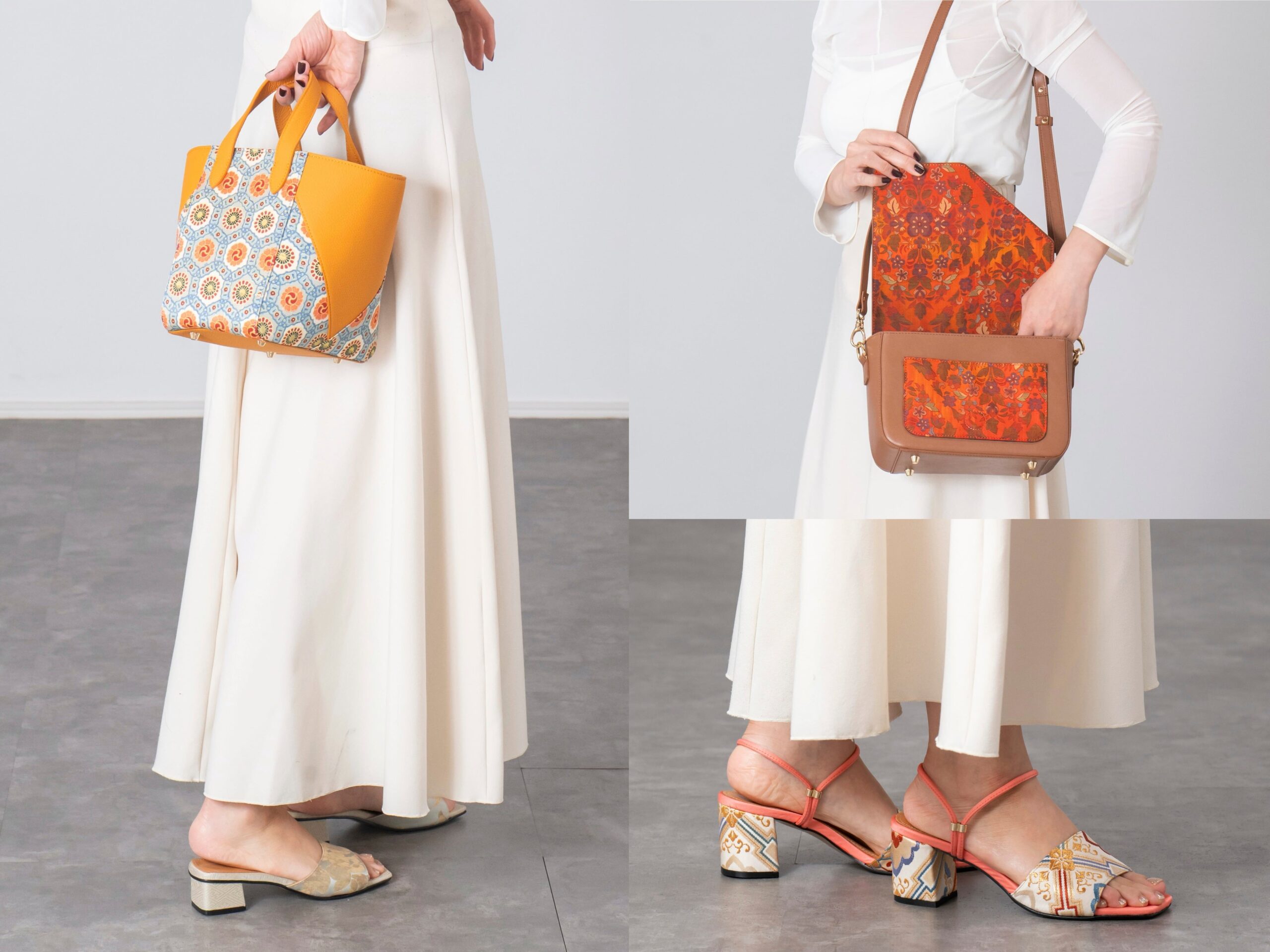 店頭では、帯をあしらったサンダル(45,980円、43,780円)やバンド付きモデル(49,280円)に加え、新作バッグのshoulder bag(38,500円)、2way bag(39,600円)、bucket bag(46,200円)などを展開します。shoulder bagには、廃棄されるりんごの搾りかすを再利用したアップルレザーを採用しました。