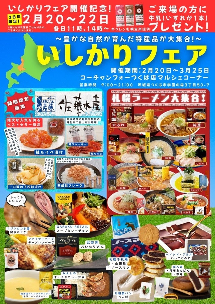 北海道石狩振興局は、石狩地域の特産品販売を中心に観光・移住情報などを発信する「いしかりフェアin首都圏」を、令和8年2月20日~3月25日にコーチャンフォー若葉台店(東京)とつくば店(茨城)で同時開催します。販売は約100商品を予定し、両店の営業時間は9時~21時です。