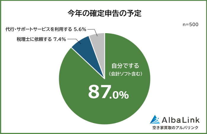 確定申告を行っている男女500人を対象にした調査で、今年の申告を「自分でする」と答えた人は87.0%でした。外部に依頼した人は税理士7.4%、申告代行・サポート5.6%の計13.0%にとどまり、最も負担に感じる作業は「必要な資料をとりまとめる」(30.6%)でした。
