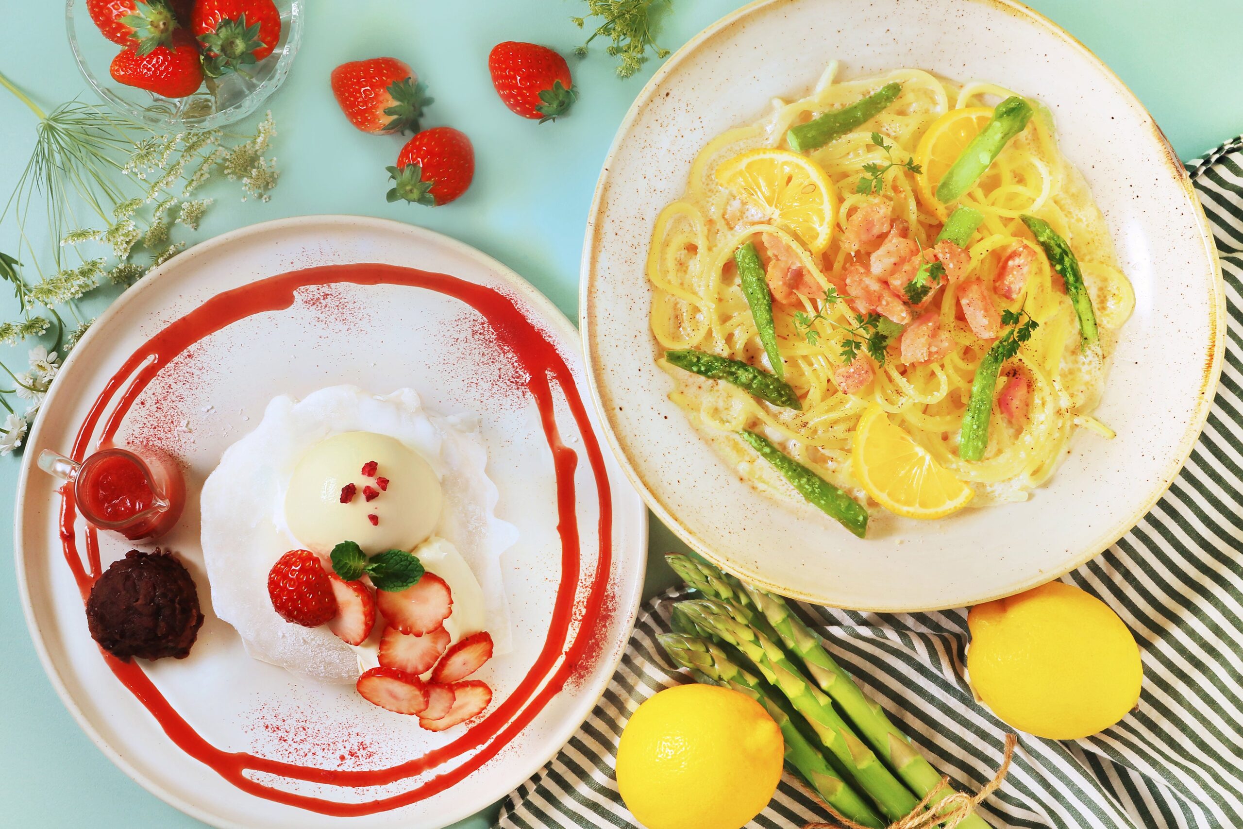 パンケーキはクリームをしのばせて求肥で包み、自家製クリームとフレッシュ苺、あんこ、苺ソースを添えて提供します。パスタはレモンクリームソースにアスパラとスモークサーモンを合わせ、春らしい酸味とコクを狙ったメニューです。レモンクリームはレモンの風味を効かせたクリーム系ソースを指します。