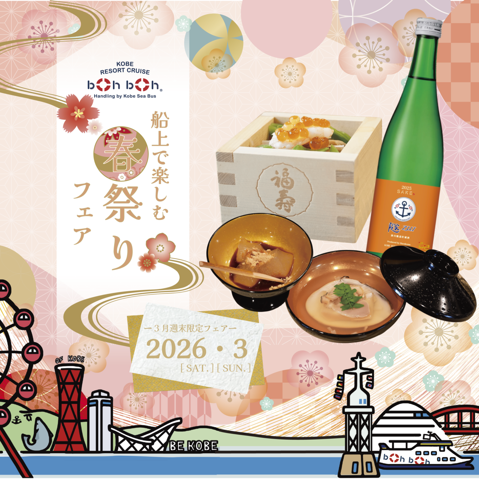 早駒運輸が運航する神戸シーバス「boh boh KOBE」は2026年3月の週末・土日祝に、船上で京都料亭「杦-SEN-」杉澤料理長監修の限定メニューを提供する「春祭りフェア in boh boh KOBE」を神戸市中央区の中突堤から実施します。予約制の「特製ちらし寿司セットプラン」は60分が大人4,500円・小人3,500円、90分が大人4,900円・小人3,900円(いずれも税込)です。