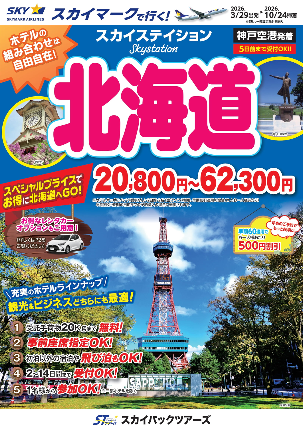 スカイパックツアーズは2月15日、スカイマーク航空券とホテルを組み合わせた価格固定型の旅行商品「スカイステイション 北海道」【神戸空港発着】の販売を始めました。最低価格は20,800円で、設定期間は2026年3月29日出発~10月24日帰着です。