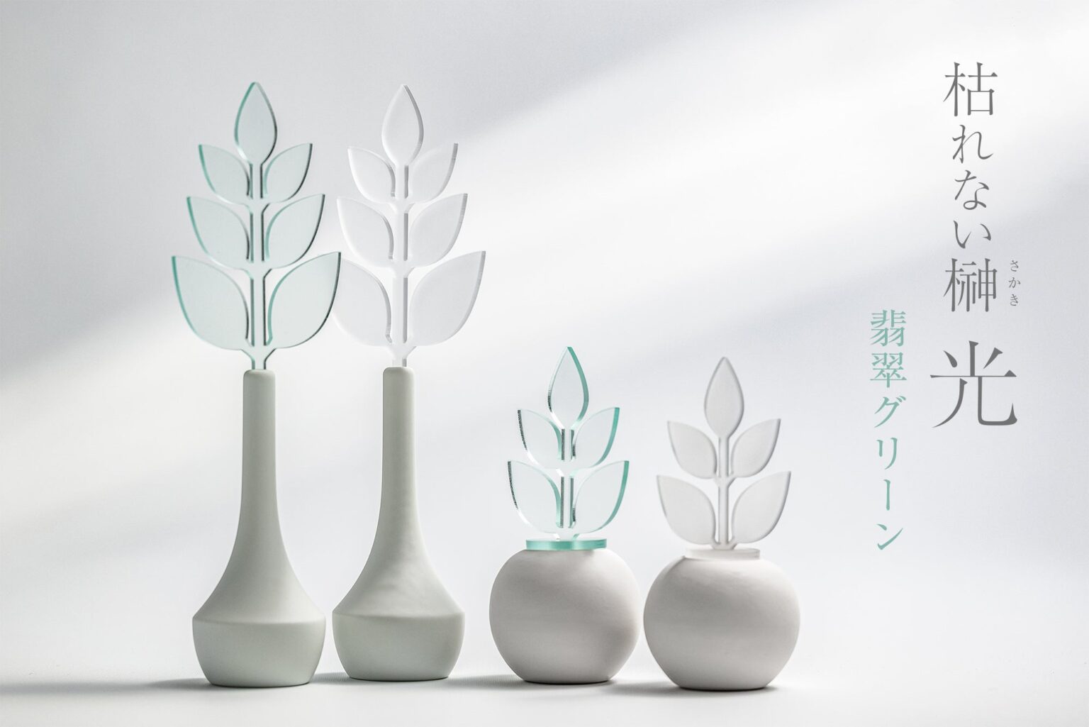 ユニグラフ(静岡市)は2月1日、神棚向けアクリル製「枯れないサカキ[光]」に新色「翡翠グリーン」を追加して発売しました。磨りガラスのような質感の「光」シリーズに、レトロなガラス調の緑色を加えます。