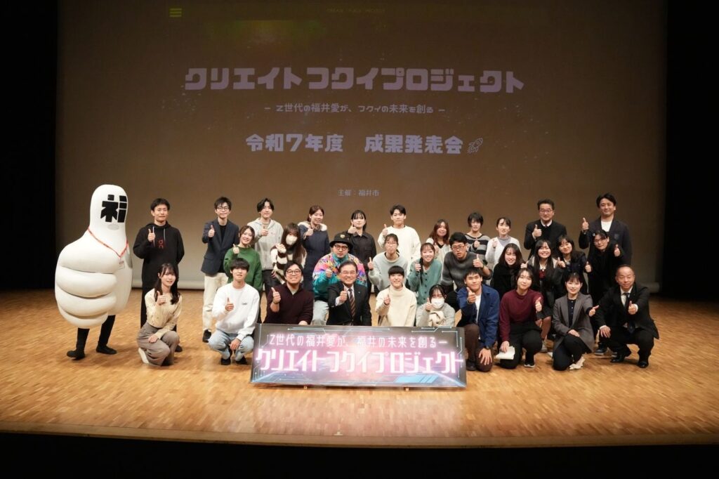福井市は2026年2月14日、「クリエイトフクイプロジェクト」の2025年度活動報告会を開き、公募で集まったZ世代42人と市役所7課の職員チームが、7つの課題解決プロジェクトの成果を発表しました。