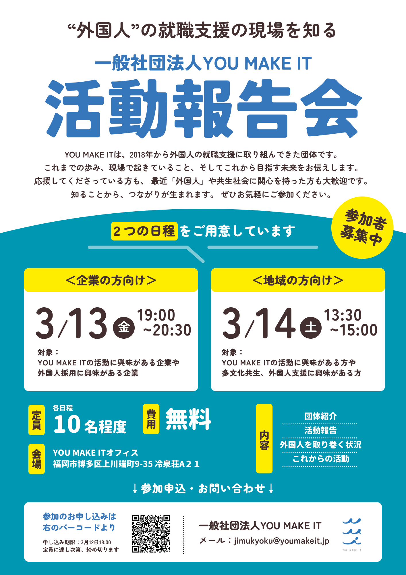 福岡市の外国人就労支援団体「YOU MAKE IT」は、設立(2020年4月24日)以来初となる活動報告会を2026年3月13日(金)・14日(土)の2日間、YMIオフィス(福岡市博多区)で無料開催します。企業向けは13日19:00〜20:30、地域住民・一般向けは14日13:30〜15:00です。申込はGoogleフォームで先着順、締切は3月12日(木)18:00です。