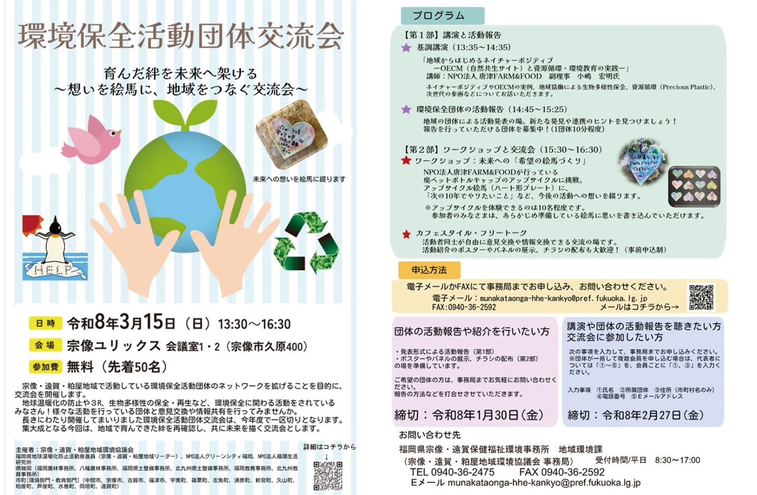NPO法人唐津Farm&Food(佐賀県唐津市)は、2026年3月15日13時30分〜16時30分に宗像ユリックス(福岡県宗像市)で開かれる「環境保全活動団体交流会」に参加し、第1部でネイチャーポジティブ(自然再興)をテーマに講演、第2部で廃ペットボトルキャップのアップサイクル体験を担当します。参加費は無料で、定員は先着50人です。