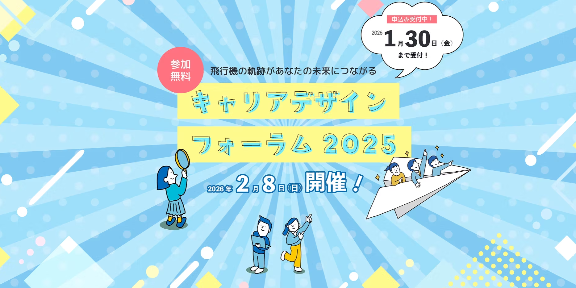 本フォーラムは、進路や将来像に不安を抱える中高生・大学生・若手社会人らに、性別などの属性にとらわれない多様なキャリアの可能性に気づいてもらうことを目的とした福岡県の事業の一環です。テーマは「紙飛行機の軌跡があなたの未来につながる」で、「叶った夢には法則がある」とされる独自の「紙飛行機メソッド」を通じて、夢の見つけ方や将来への不安との向き合い方を学ぶ構成になっています。