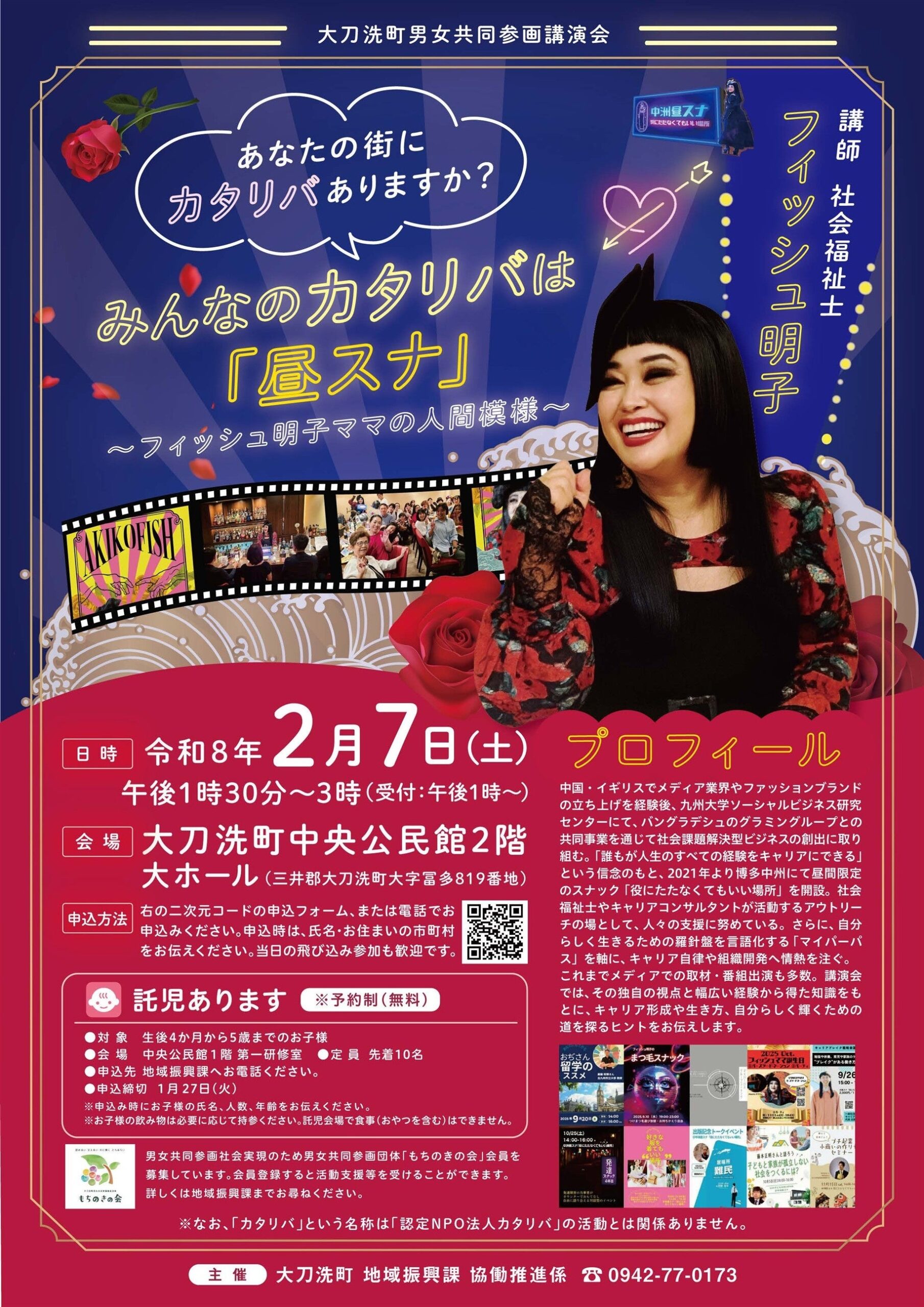 福岡県大刀洗町は、男女共同参画をテーマにした講演会「男女共同参画講演会~フィッシュ明子ママの人間模様~」を開催します。講師は社会福祉士のフィッシュ明子さんで、子どもから大人まで参加でき、当日の参加も可能です。講演では、男女共同参画(性別にかかわらず対等に参画できる社会)の考え方を軸に、キャリア形成や生き方、自分らしさを見つめ直すためのヒントを紹介します。登壇者の経験に基づく生活者目線の内容としており、町は幅広い世代の理解促進につなげたい考えです。開催日時、会場、参加費、定員、申込方法などの詳細は町の案内ページで確認できます。今後は、参加者の反応や地域課題に応じて、学びの機会を継続的に設けるかが焦点となりそうです。