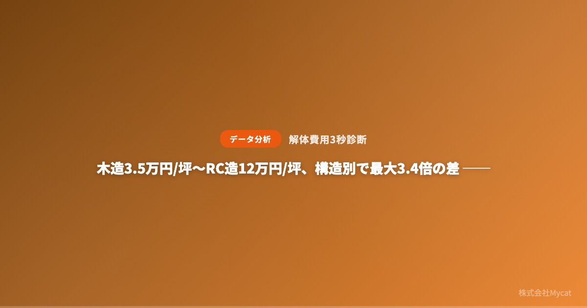 Mycat(東京都目黒区)が運営する「解体費用3秒診断」は2026年3月19日、国交省や総務省などの公開データを基に、建物構造別・地域別の解体費用相場と、改正空き家対策特別措置法(2023年12月施行)を踏まえた空き家放置コストの試算を整理し公開しました。木造は3.5〜6万円/坪、RC造は7〜12万円/坪とし、構造差で最大3.4倍の開きが出るとしています。