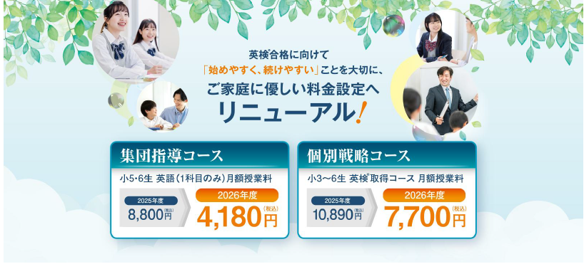 英検®合格サポートキャンペーン:小学1年生から中学3年生までの塾生を対象に、2026年度の英検®検定料を1回分負担
