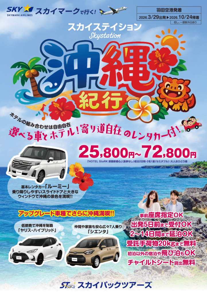 スカイパックツアーズは、羽田空港発着でスカイマークを利用する沖縄本島向け旅行商品「スカイステイション 選べるレンタカー付 沖縄」の販売を始めました。設定期間は2026年3月29日出発から10月24日帰着までで、価格は25,800円からです。