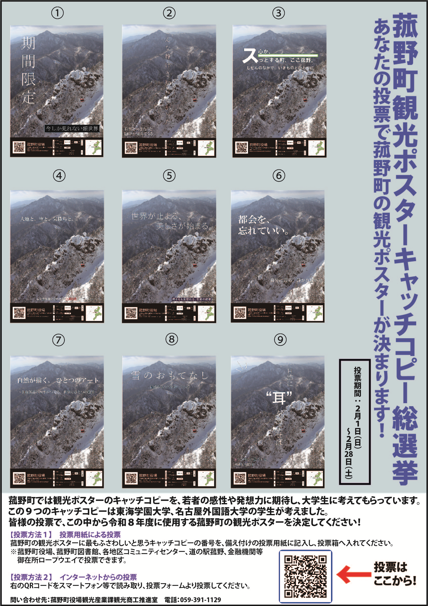 三重県菰野町は、令和8年度の観光PRポスターに使うキャッチコピーを決める「菰野町観光ポスターキャッチコピー総選挙」を始めます。候補は大学生が考案した9作品で、投票期間は令和8年2月1日から2月28日までです。結果は3月上旬ごろに公表し、最多得票作品を採用します。