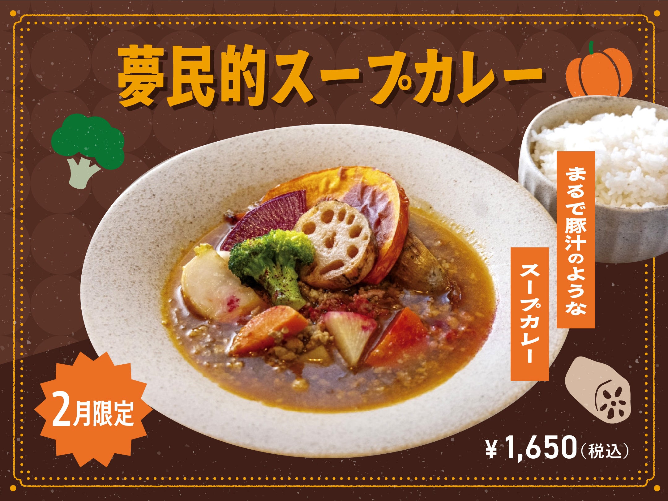 東京都港区西新橋のカレー専門店「Spice and Vegetable 夢民」は、2月2日(月)~2月28日(土)の期間、季節限定メニューとして新作「夢民的スープカレー」(税込1,650円)と「金柑はちみつラッシー」(税込600円)を提供します。両方をセットで注文すると、ラッシーは通常600円から400円に割り引きます。