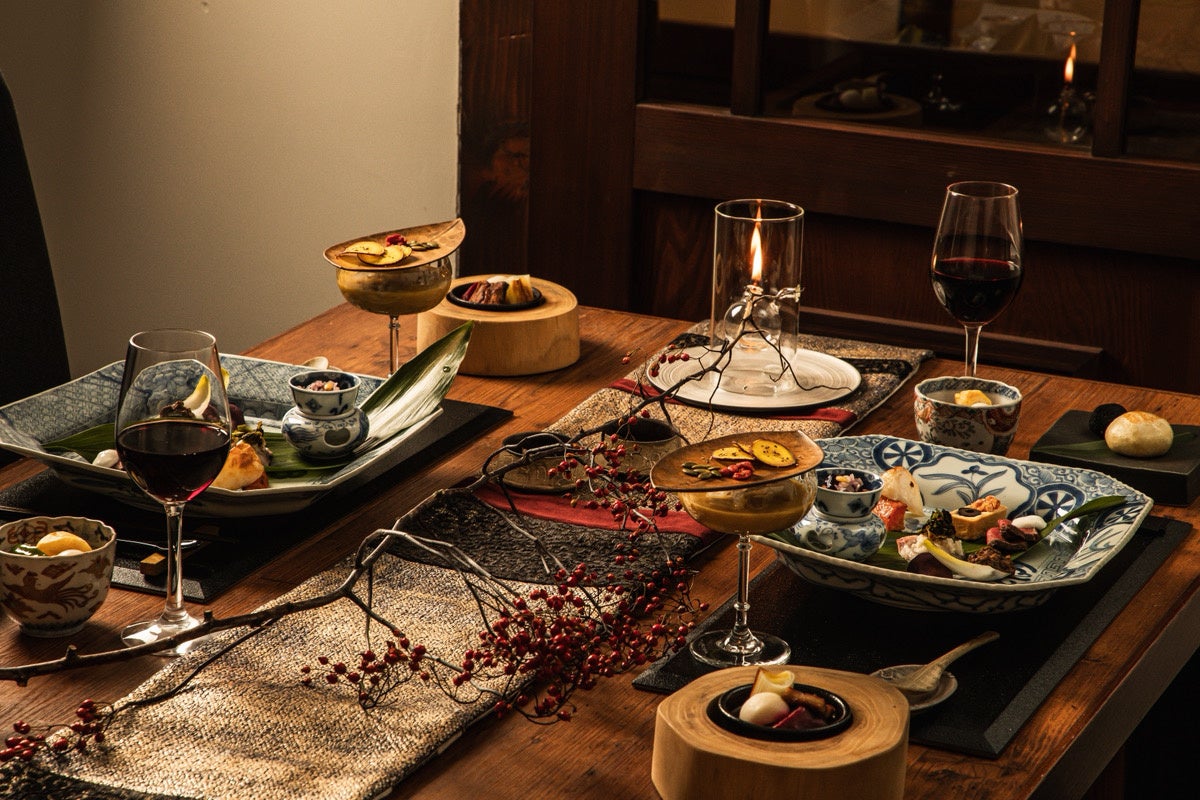 夕食は古伊万里などのアンティーク食器を基調に、有田焼や漆器、作家ものを組み合わせて提供します。朝食では、岩崎葉子がデザインした「世界に一つだけの信楽焼の器」などを用い、料理に合わせた器選びそのものを体験価値として打ち出します。