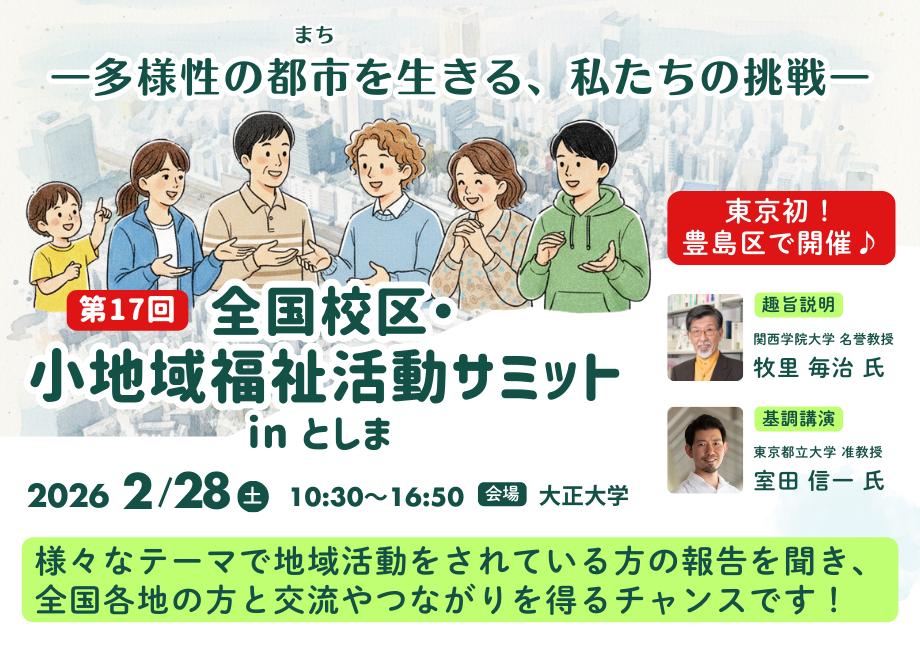 豊島区で「第17回全国校区・小地域福祉活動サミットinとしま」が2026年2月28日、 大正大学(豊島区西巣鴨3-20-1)で開かれます。全国校区・小地域福祉活動サミットの東京開催は初で、定員は600人の先着制です。申込受付は2025年12月15日から2026年2月1日までで、参加費は一般3,000円、学生1,500円です。