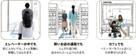 特徴は、ハンドルレバー操作で4輪すべてをフリーにし、ベビーカーを真横へスライド移動できる点です。人混みや狭い通路でも進行方向の切り返しを減らし、取り回しをしやすくする狙いがあります。