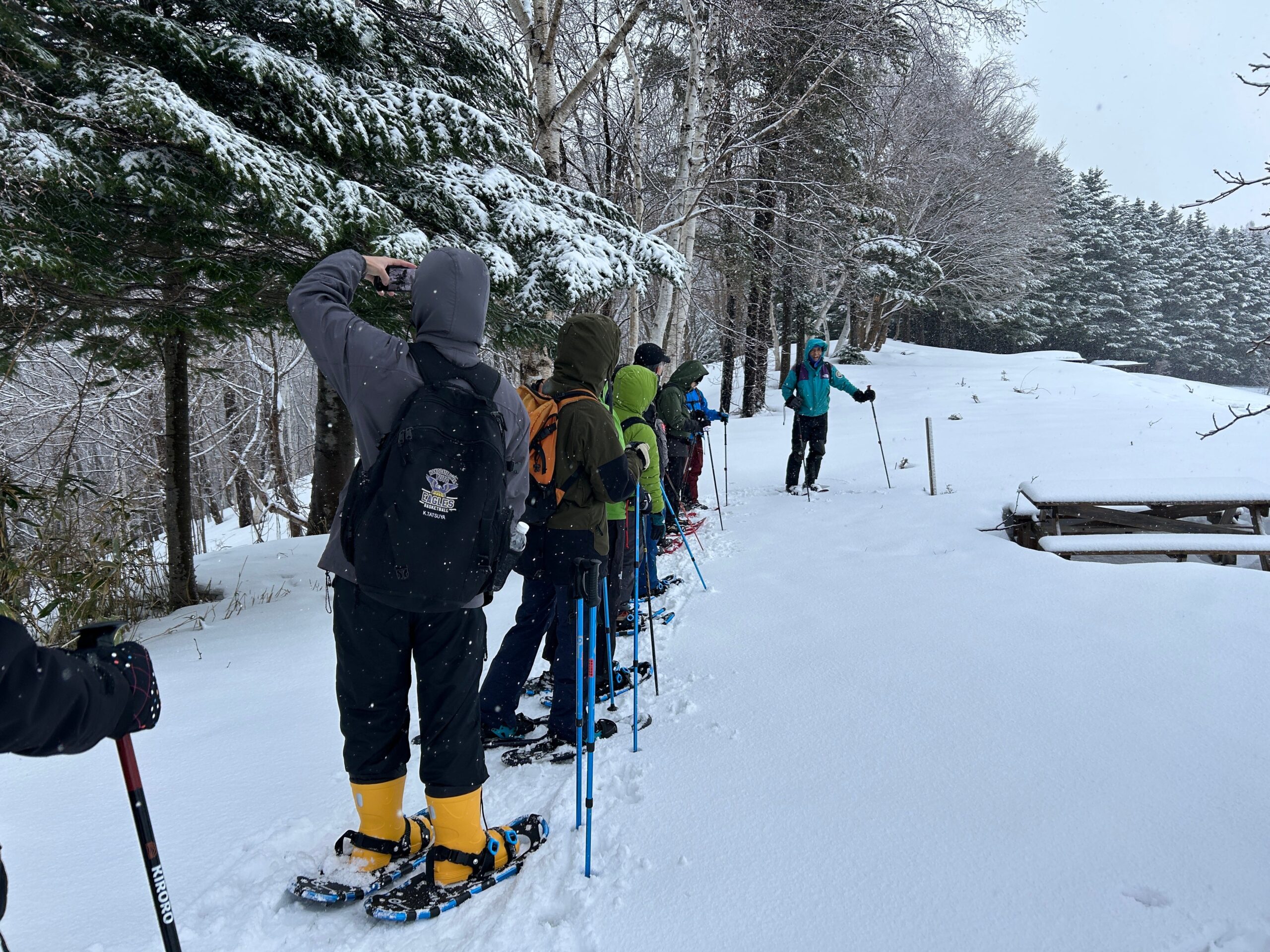 当初は赤井川村で稜線ハイクを予定していましたが、強風雪のため朝7:00の協議で中止を決定し、北海道余市郡仁木町のNIKI Hills Wineryに会場を変更しました。現地ではスノーシューでの施設周辺散策や尻滑り、スノーモービルを活用した犬ぞり(アイアンドッグ)体験、室内での冒険教室を実施しました。