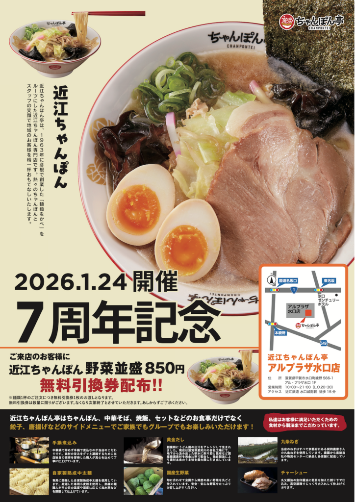 ドリームフーズが運営する「近江ちゃんぽん亭 アル・プラザ水口店」(滋賀県甲賀市)は2026年1月24日、開店7周年を記念した1日限定の「7周年記念 周年祭」を開きます。当日は麺類を1杯注文すると、「近江ちゃんぽん(野菜並盛)無料引換券」を1枚配布します。数量限定で、なくなり次第終了です。