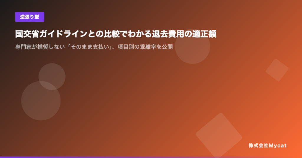 株式会社Mycat(東京都目黒区)は2026年3月25日、AI退去費用適正診断サービス「退去費用 払いすぎ診断」の運営データ(推計値)を基に、国土交通省ガイドラインに沿った適正額と実際の退去時請求額の差を項目別に分析したレポートを公開しました。壁紙張替えやハウスクリーニング、鍵交換などを合算した全体の乖離率(平均・推計)は47%としています。