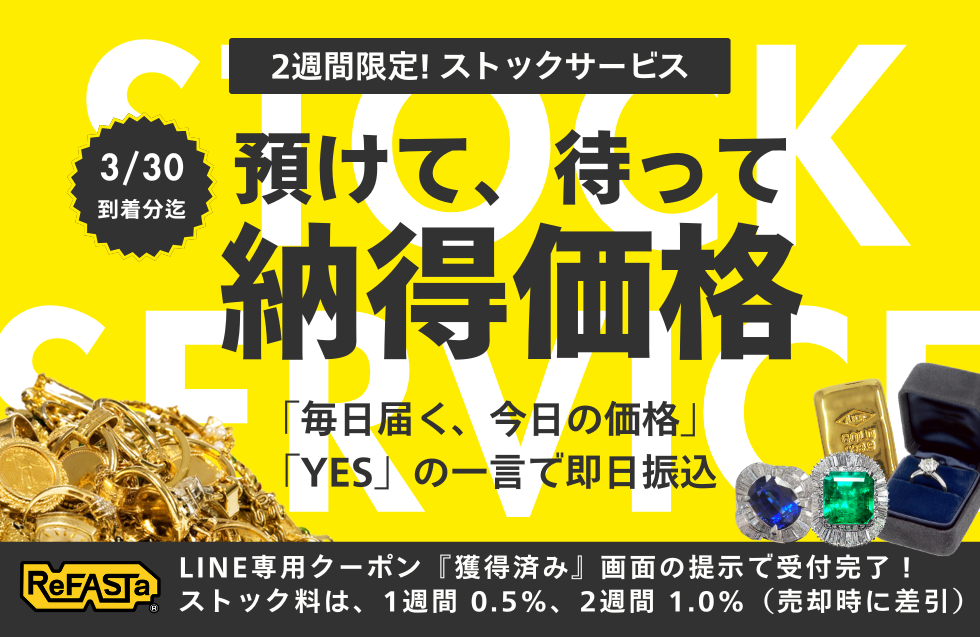買取専門サイト「リファスタ」は、宅配で届いた金・プラチナなどを到着後すぐに売却確定せず、最大2週間(14日間)保管して利用者が売却タイミングを選べる「貴金属ストック買取サービス」を、2026年3月20日〜3月30日到着分まで期間限定でプレスタートします。対象は宅配買取のほか、実店舗(東京池袋本店・大阪心斎橋店)でも受け付けます。