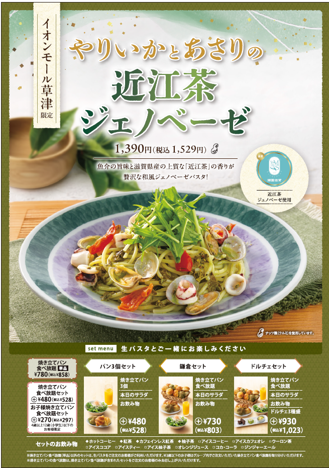 鎌倉パスタ イオンモール草津店(滋賀県草津市)は2026年2月21日(土)から、店舗限定メニュー「やりいかとあさりの近江茶ジェノベーゼ」を販売します。価格は1,390円(税込1,529円)です。ソースには、就労継続支援B型作業所「ビストロ向日葵」(合同会社ふくろう、草津市)が製造・販売する『近江茶ジェノベーゼ』を使用します。