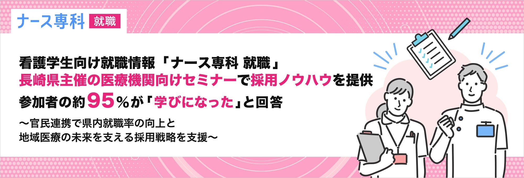 長崎県内の医療機関の採用担当者向けに、看護学生向け就職情報「ナース専科 就職」を運営するエス・エム・エスが採用力向上セミナーをオンラインで実施し、参加者の約95%が「学びになった」と回答しました。開催は2025年10月16日、23日、28日の計3回で、主催は長崎県福祉保健部 医療人材対策室です。