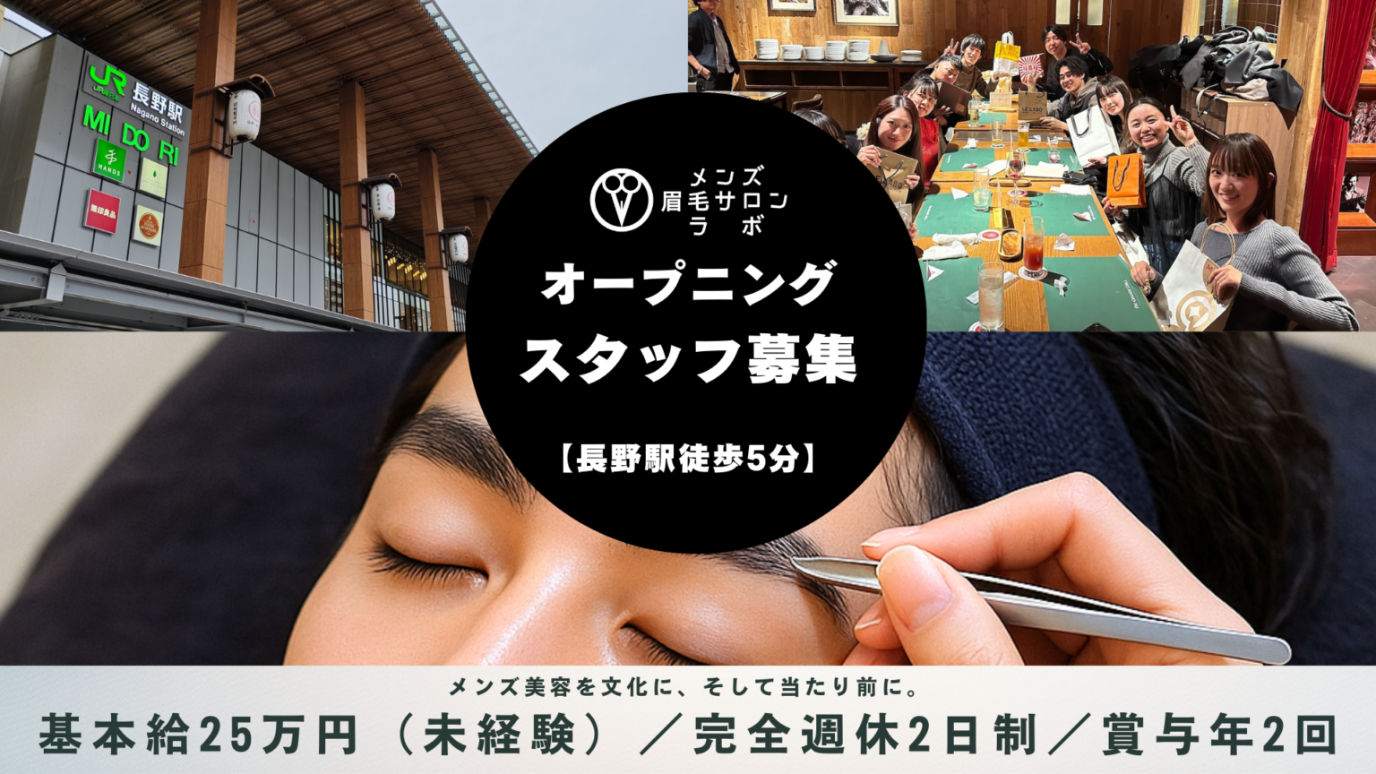 アローズプラス(東京都渋谷区)が運営する男性専門アイブロウサロン「メンズ眉毛サロンラボ」は、2026年に長野駅前(駅から徒歩5分圏)で新店舗を開業予定で、美容師免許を必須とするオープニングスタッフ(正社員)の募集を始めました。未経験者の基本給は25万円で、賞与は年2回、交通費は全額支給、歩合は最大50%としています。勤務先は長野市南千歳2-15-14 ニシキ電器ビル1Fです。東京・神奈川・千葉で7店舗を展開し、累計来店は45,000人超といい、施術は眉デザイン、ワックス脱毛、フェイシャルケアなど男性の身だしなみ領域を担います。ワックス脱毛は専用ワックスで毛を処理する方法で、眉周りを整えやすいのが特徴です。新店開業を機に長野エリアでの展開を足がかりに全国拡大を進める方針です。