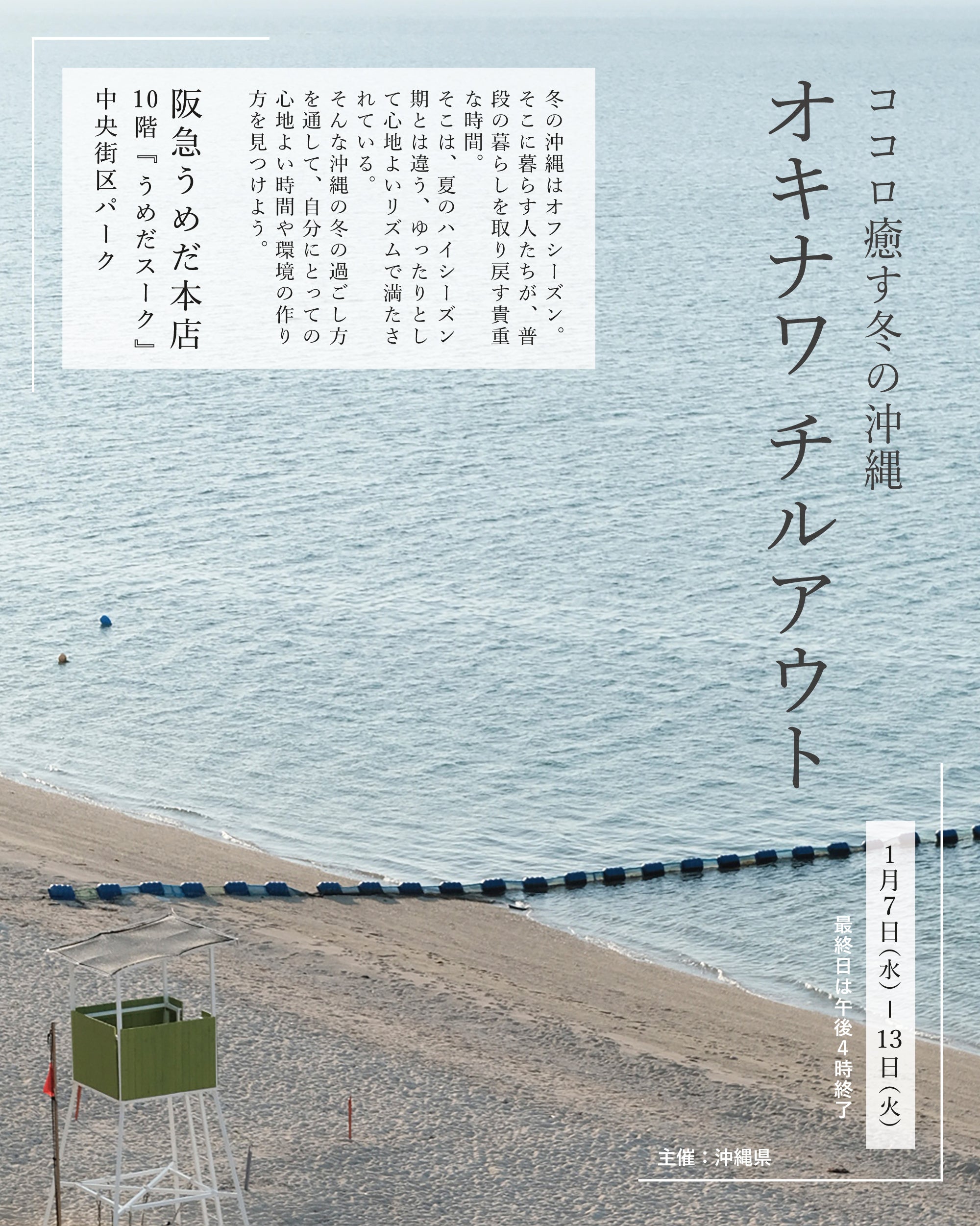 沖縄県は2026年1月7日〜13日、大阪の阪急うめだ本店10階「うめだスーク」中央街区パークで、冬の沖縄の過ごし方を体感できるイベント「〜ココロ癒す冬の沖縄〜 オキナワ チルアウト」を開きます。営業時間は10時〜20時で、最終日は16時までです。