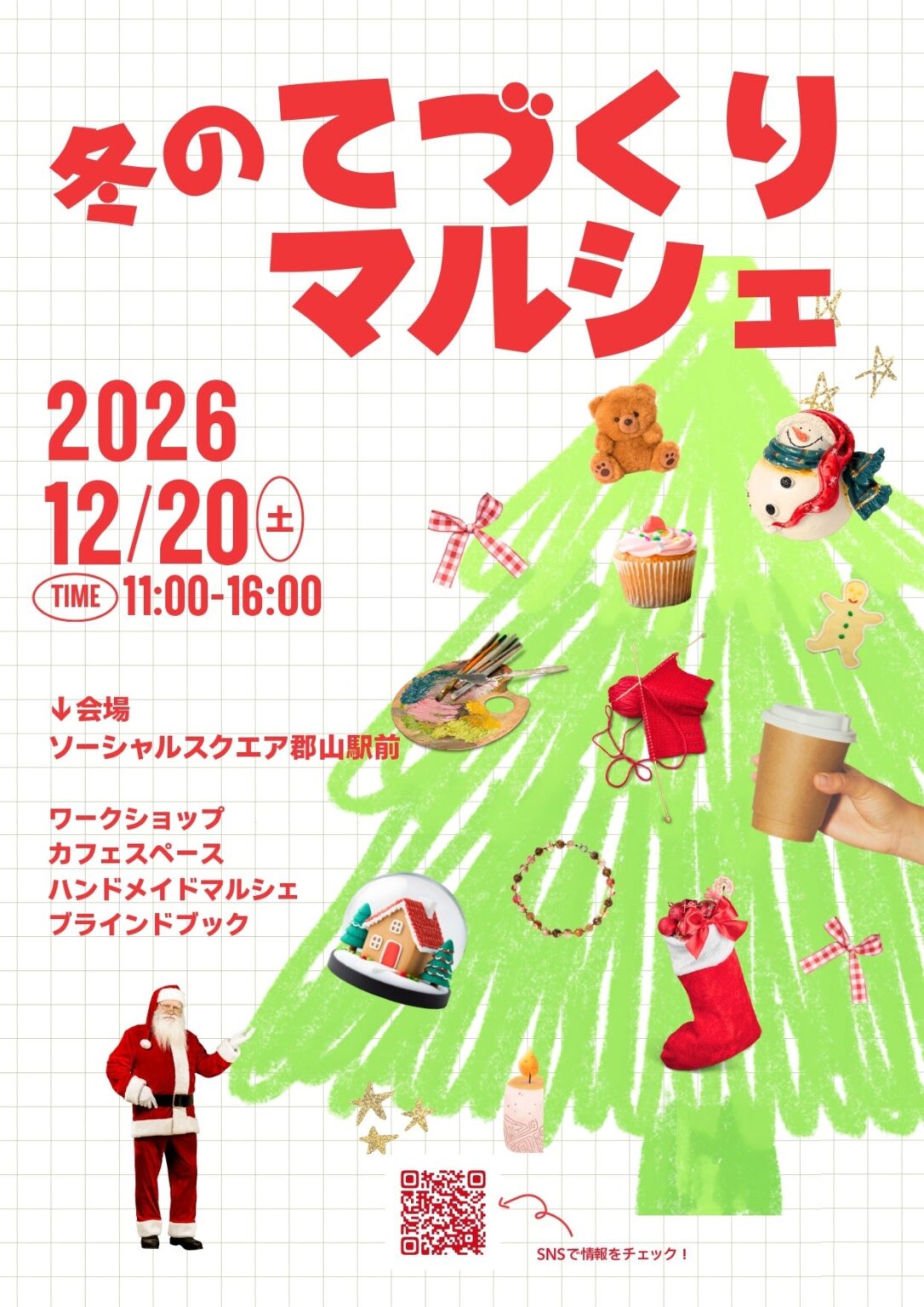 福島県郡山市のソーシャルスクエア郡山駅前店で、2025年12月20日(土)11時〜16時に「冬のてづくりマルシェ」が開かれます。会場は郡山駅前1丁目7-8で、入場は無料です(コーヒーは有料)。障害の有無や国籍、年齢などにかかわらず誰もが参加できる地域イベントとして実施されます。