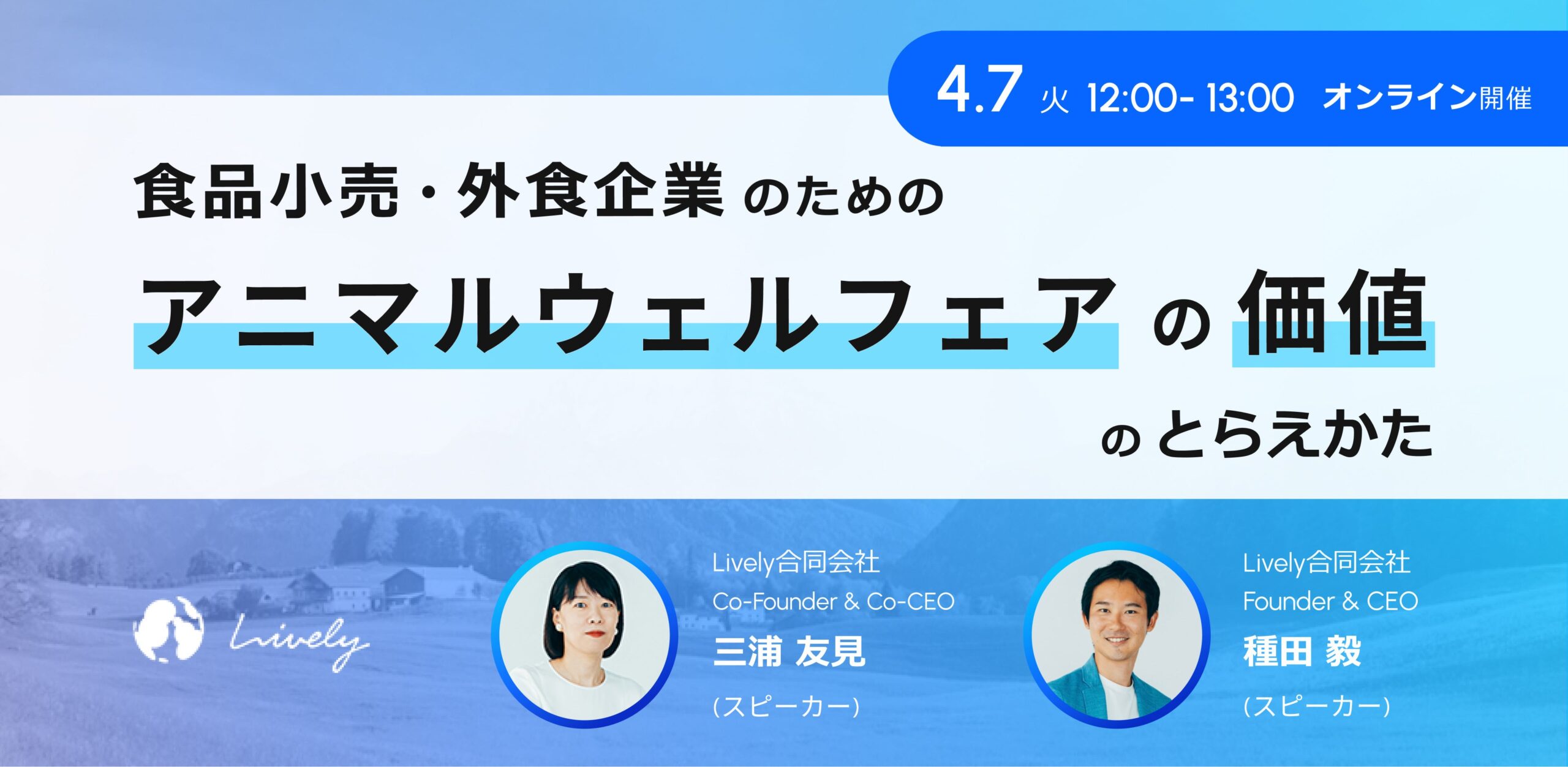 Lively(東京都千代田区)は、ウェビナー「食品小売・外食企業のためのアニマルウェルフェアの価値のとらえかた」を2026年4月7日(火)12:00〜13:00にZoomで開催します。参加費は無料で、入退室は自由です。登壇は三浦友見Co-Founder & Co-CEOと種田毅Founder & CEOが務めます。