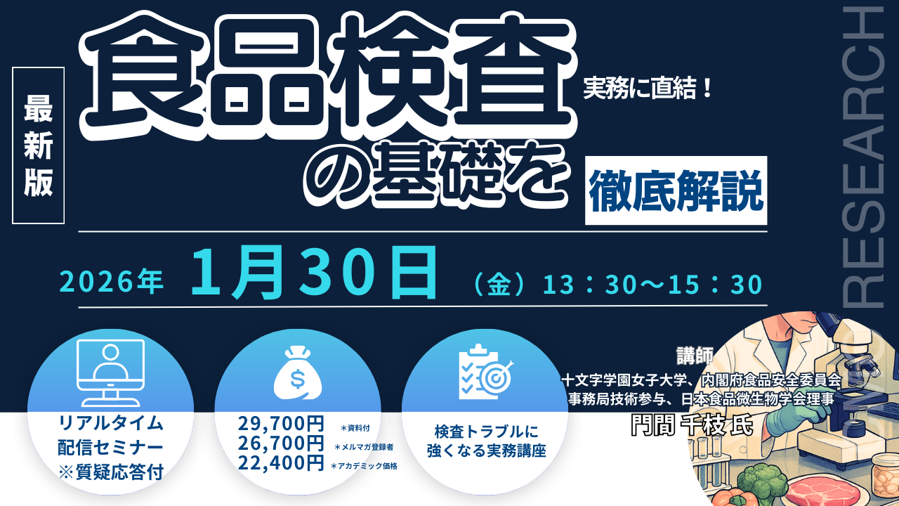 食品検査の基礎を実務目線で学ぶオンラインセミナー「実務に直結! 食品検査の基礎を徹底解説」が、2026年1月30日(金)13:30~15:30にZoomで開かれます。講師は十文字学園女子大学の門間千枝氏で、受講料は一般2万9700円、メルマガ会員2万6700円、アカデミック2万2400円(税込)です。