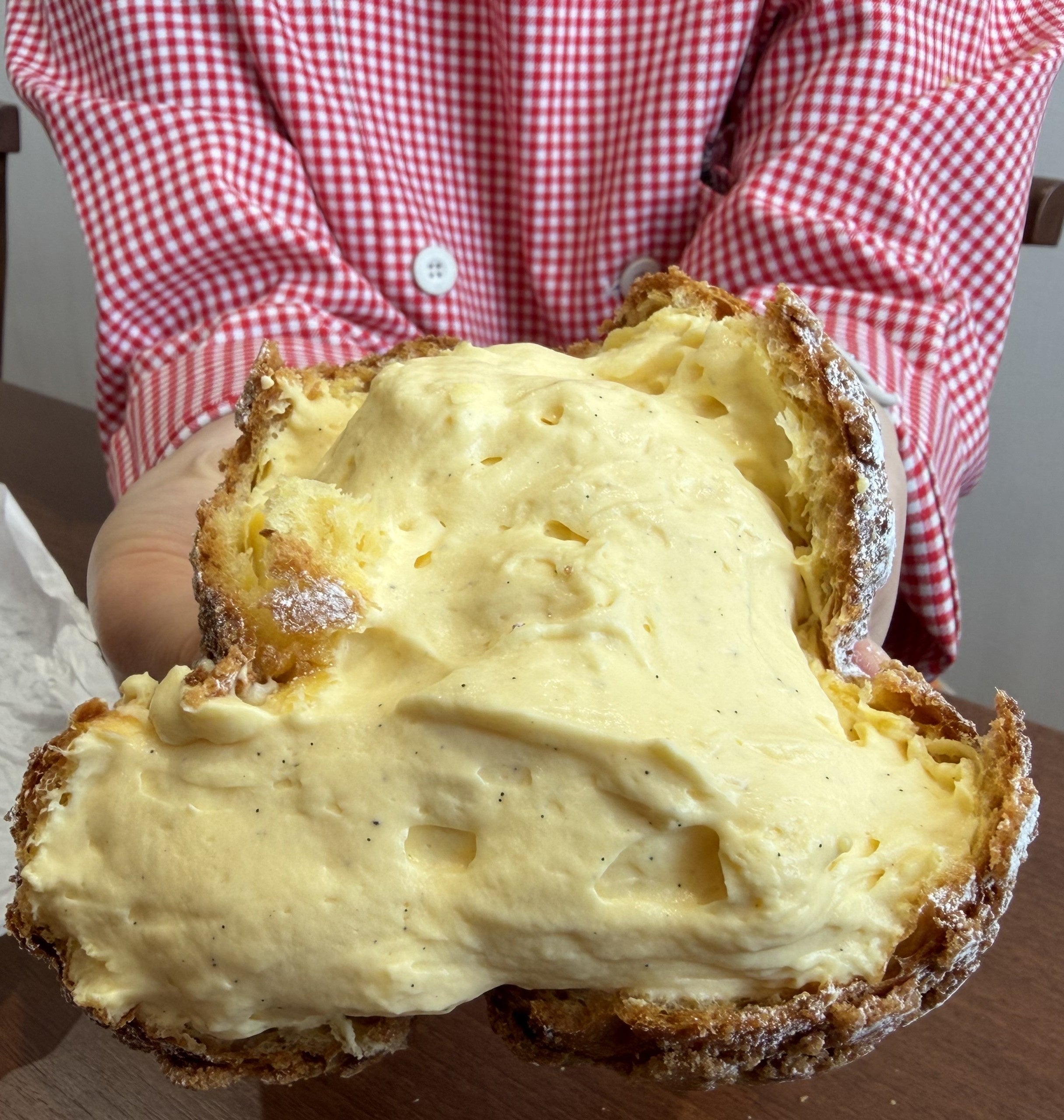 製法では、水を使わず魚沼牛乳100%で生地を練り、新潟県産卵を使ったカスタードを注文後に注入します。注文後にクリームを入れることで、ザクザクした食感を保ち、出来たての体験を提供する狙いです。