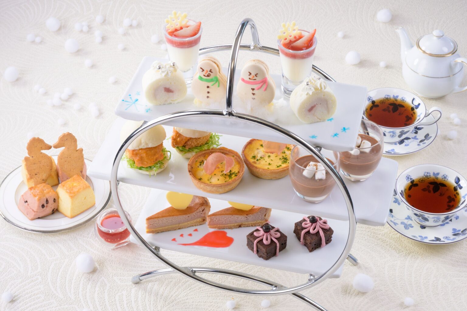 別皿では、月替わりチーズケーキ「スノーフロマージュ」(1月はいちご、2月はチョコレート)や、月ごとに味が変わるスコーン、たつのおとしご型クッキーを用意。飲み物は英国王室御用達ブランドの紅茶のほか、三重県産の伊勢和紅茶やコーヒー、アイスティーから選べます。