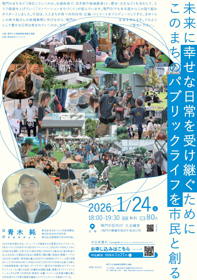 徳島県鳴門市は、空き家や地域資源を生かしてエリア価値を高める「リノベーションまちづくり」をテーマにした講演会を、2026年1月24日(土)18時~19時30分に鳴門市役所2階大会議室で開きます。参加費は無料で、定員は先着80人です。講師は株式会社まめくらし代表取締役の青木純氏で、公園やストリートのプロデュースなど各地の実践事例を紹介します。鳴門市はこの取り組みを今年度から開始しており、具体例の学習を通じて、空き家活用やまちのにぎわい創出を進める狙いです。今後は講演会で得た知見を踏まえ、地域の担い手や既存資源をつないだ事業形成が進むかが焦点になります。
