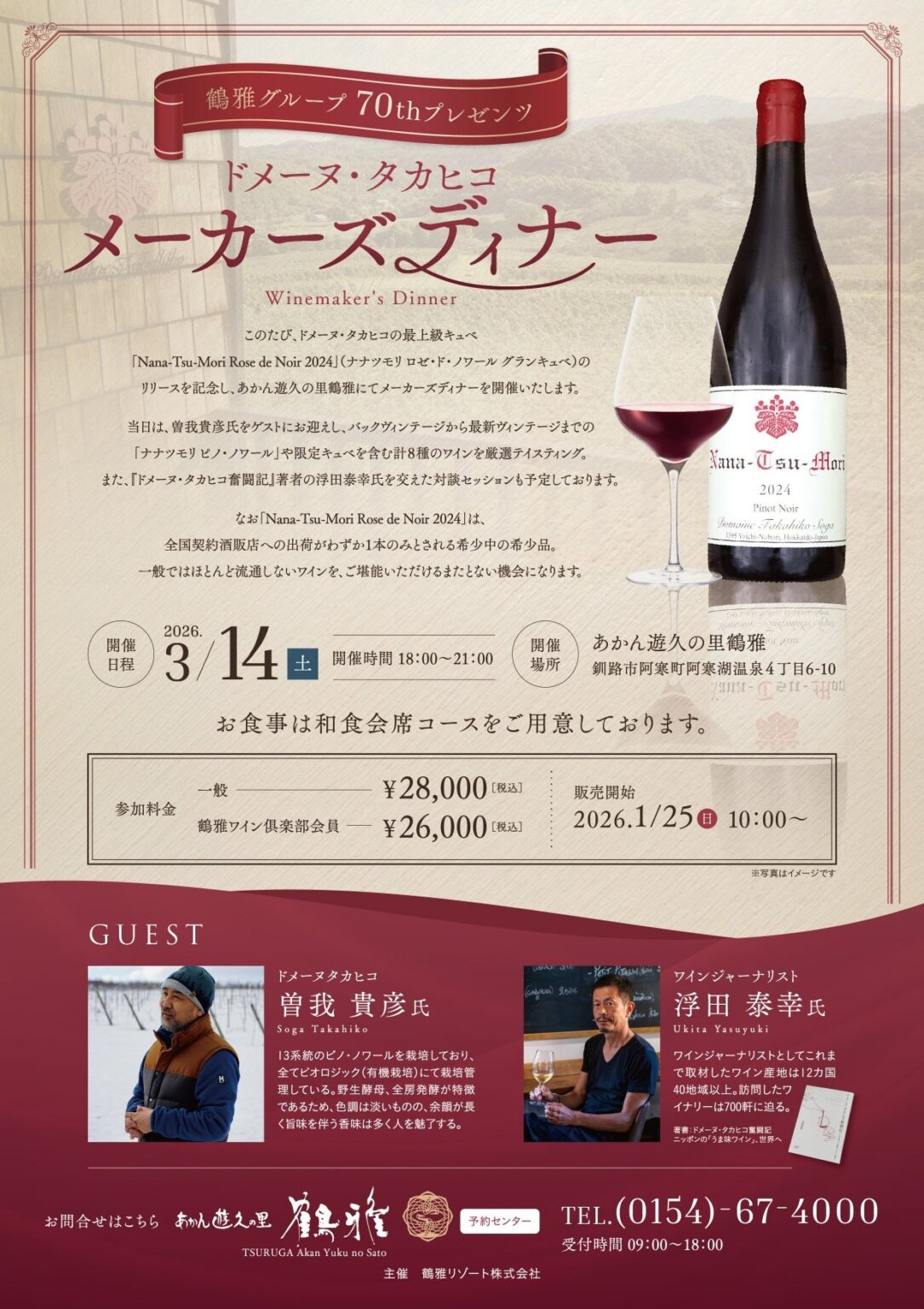 鶴雅リゾートは2026年3月14日18時から、あかん遊久の里 鶴雅(北海道釧路市阿寒町)で、「ドメーヌ・タカヒコ」の最上級キュベ「Nana-Tsu-Mori Rose de Noir 2024」リリースを記念したメーカーズディナーを開きます。提供するテイスティングワインは限定キュベを含む計8種で、定員50人は完売しています。