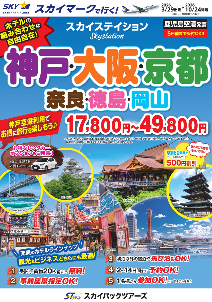 スカイパックツアーズは2026年3月28日、鹿児島空港発着で神戸空港を利用する価格固定型パンフレット商品「スカイステイション 神戸・大阪・京都・奈良・徳島・岡山」の販売を始めた。価格は17,800円からで、設定期間は2026年3月29日出発~10月24日帰着。