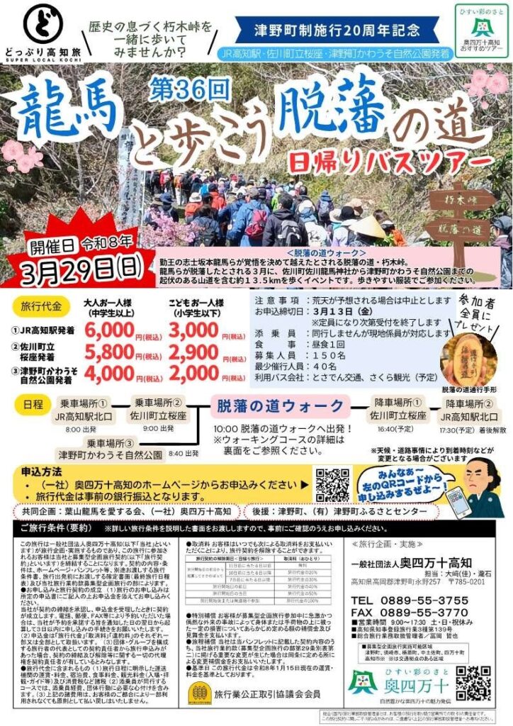 高知県津野町は3月29日(日)10:00~16:00(バス移動時間を除く)、佐川町から津野町永野まで約13.5kmを歩くウォーキングイベント「第36回 龍馬と歩こう 脱藩の道」を開きます。小雨決行で、荒天時は中止です。