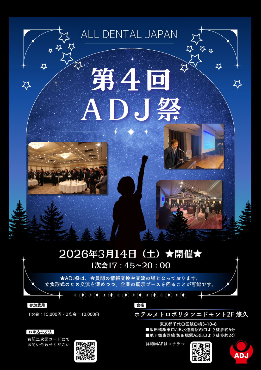 歯科業界の交流イベント「第4回ADJ祭」が2026年3月14日(土)17時45分〜20時、東京都千代田区のホテルメトロポリタン エドモント2階「悠久」で開かれます。会場は立食形式で、ブース出展は歯科関連を中心に計30社としています。
